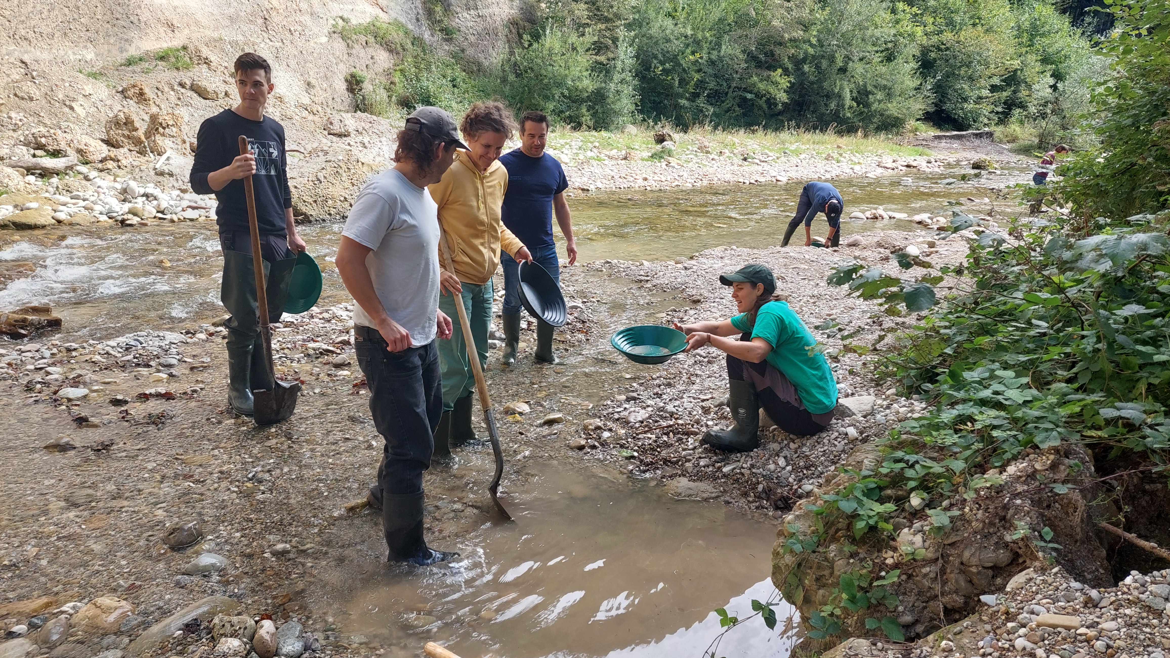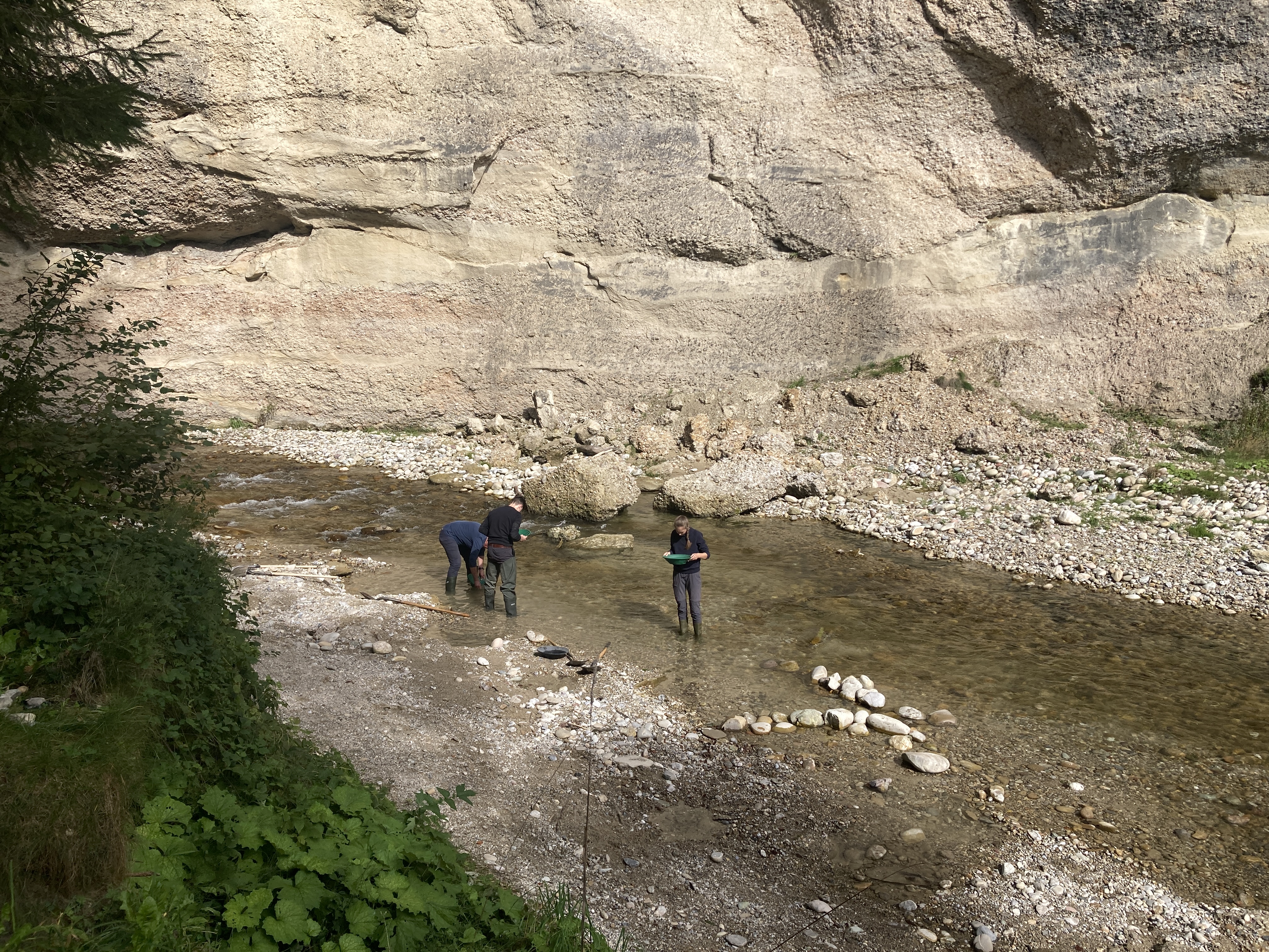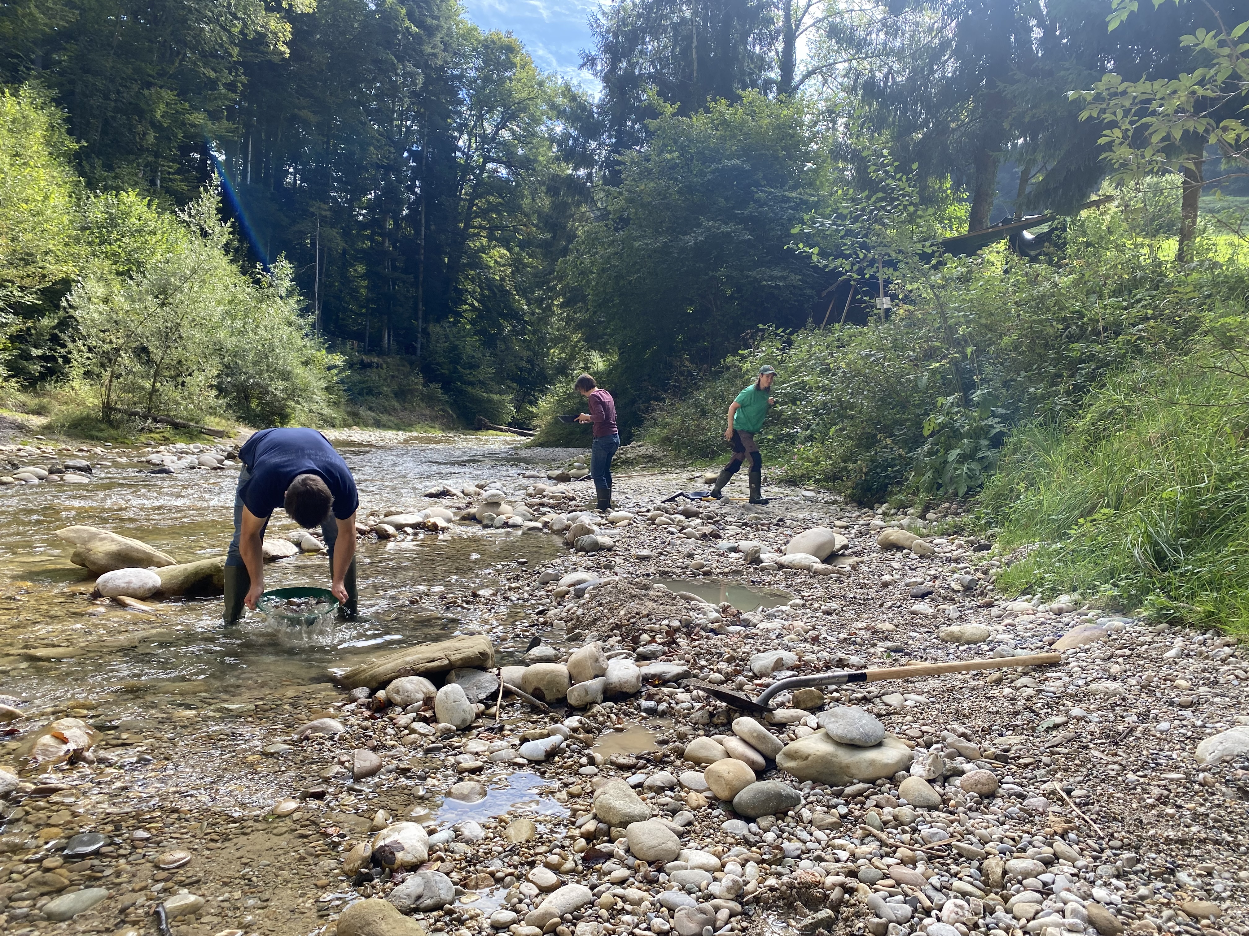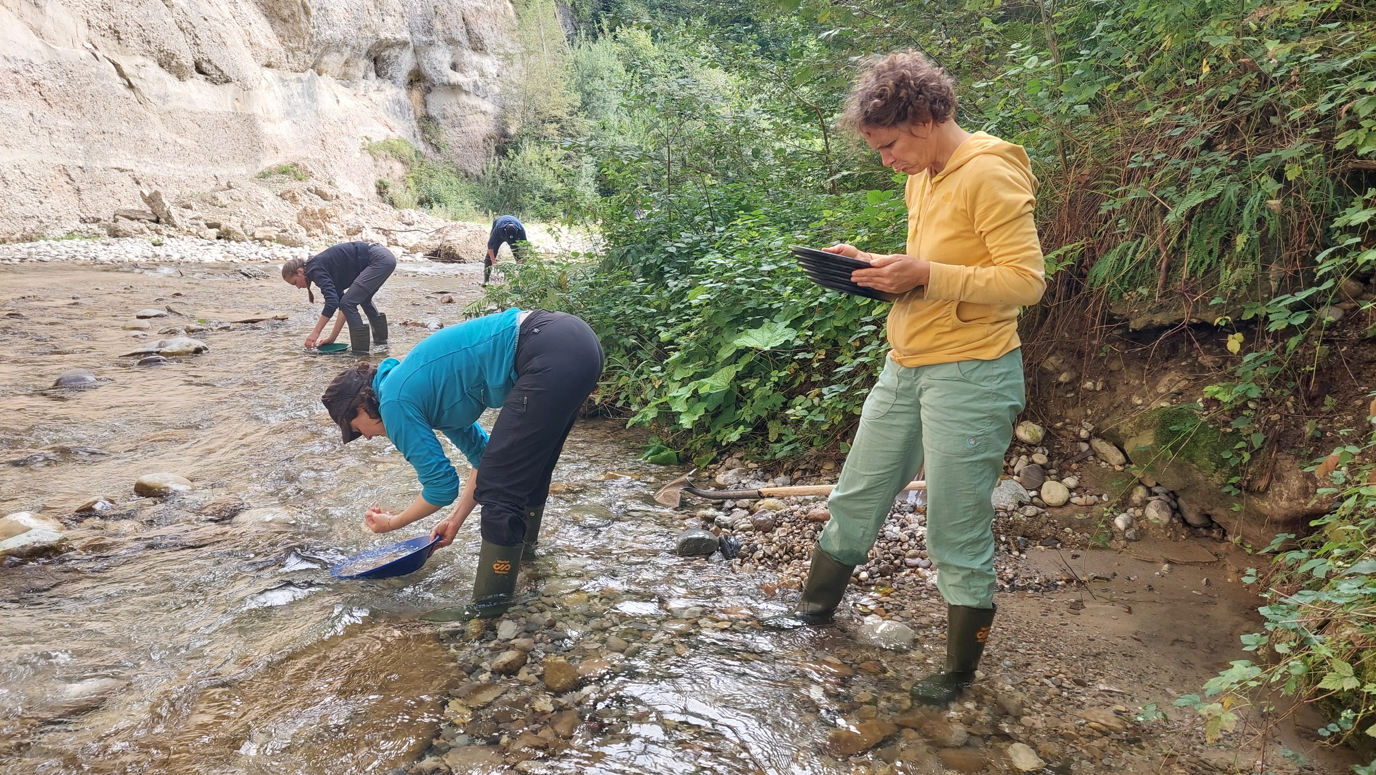 Mitte September haben wir den Büroalltag gegen Gummistiefel, Goldpfannen und das Plätschern eines Baches getauscht – und sind im Entlebuch dem Goldfieber verfallen. Inmitten der beeindruckenden Landschaft des UNESCO-Biosphärenreservats durften wir gemeinsam mit Nathan Mäder in die Welt des Goldwaschens eintauchen. Mit geübter Hand und viel Geduld zeigte uns Nathan, wie man die Goldpfanne richtig schwingt, um winzige, aber echte Goldflitter aus dem Bachsediment zu filtern. Was auf den ersten Blick einfach wirkt, verlangte Ausdauer, einen scharfen Blick und einen sicheren Griff. Gebückt im kühlen Wasser, mit konzentriertem Blick auf das Kiesgemisch, erlebten wir hautnah, wie meditativ und zugleich spannend Goldwaschen sein kann. Und tatsächlich – bei den meisten von uns blitzte es golden in der Pfanne! Nach ein paar intensiven Stunden im Bachbett machten wir es uns in Campingstühlen bequem und liessen den Ausflug mit Grillschnecken und Halloumi vom Feuer ausklingen.